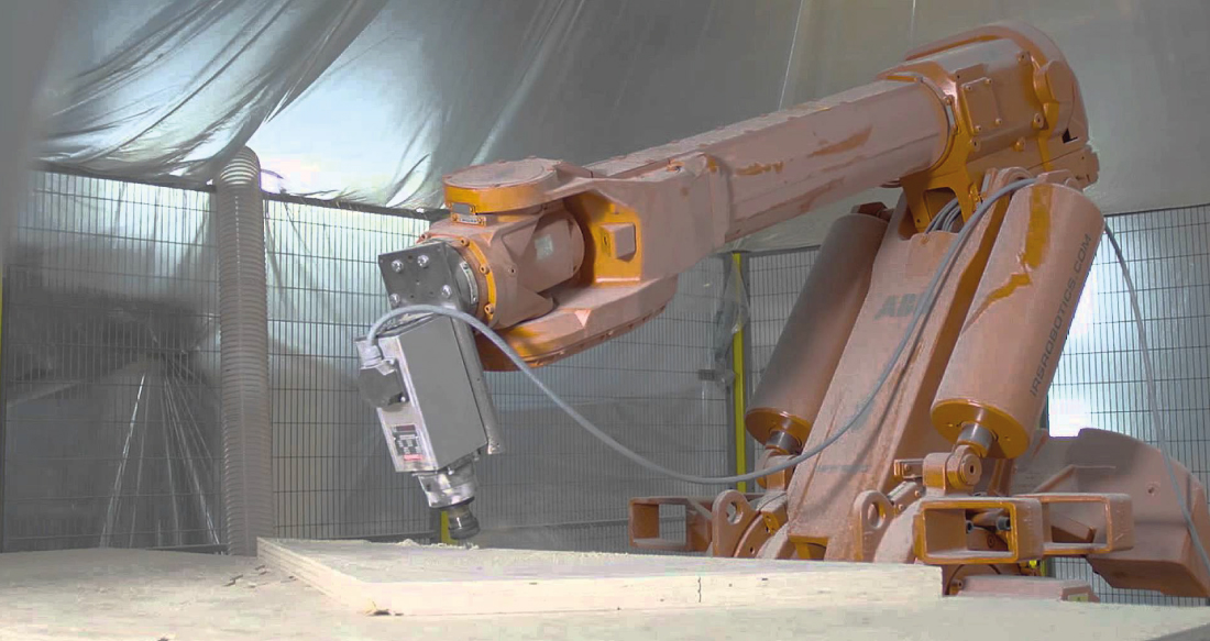 La idea no es exactamente la de un robot alternando ladrillos y capas de cemento, sino que un enorme brazo robótico ha laminado y cortado gran cantidad de paneles de madera con precisión, para darles una conformación específica.